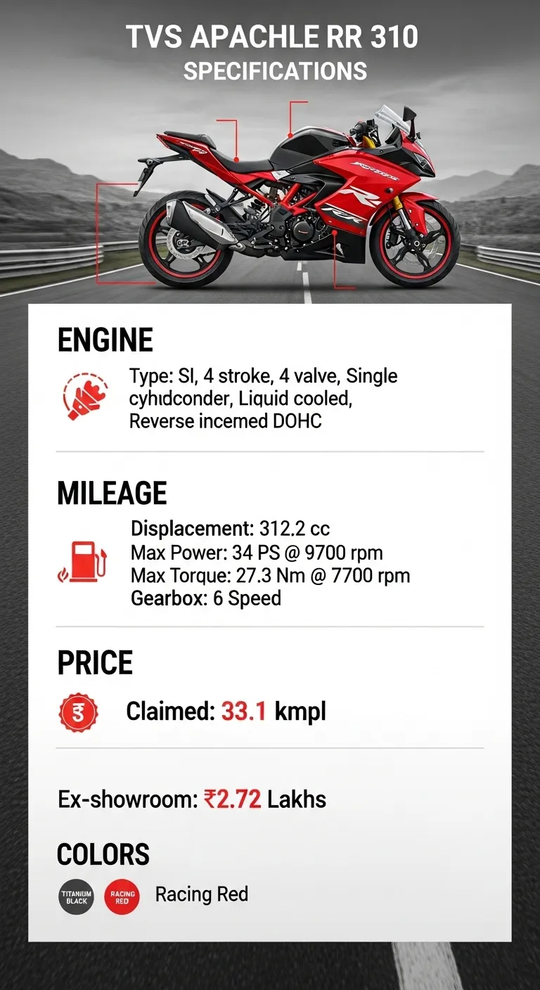 Infographic-style image showing TVS Apache RR 310 specifications like engine, mileage, price, colors